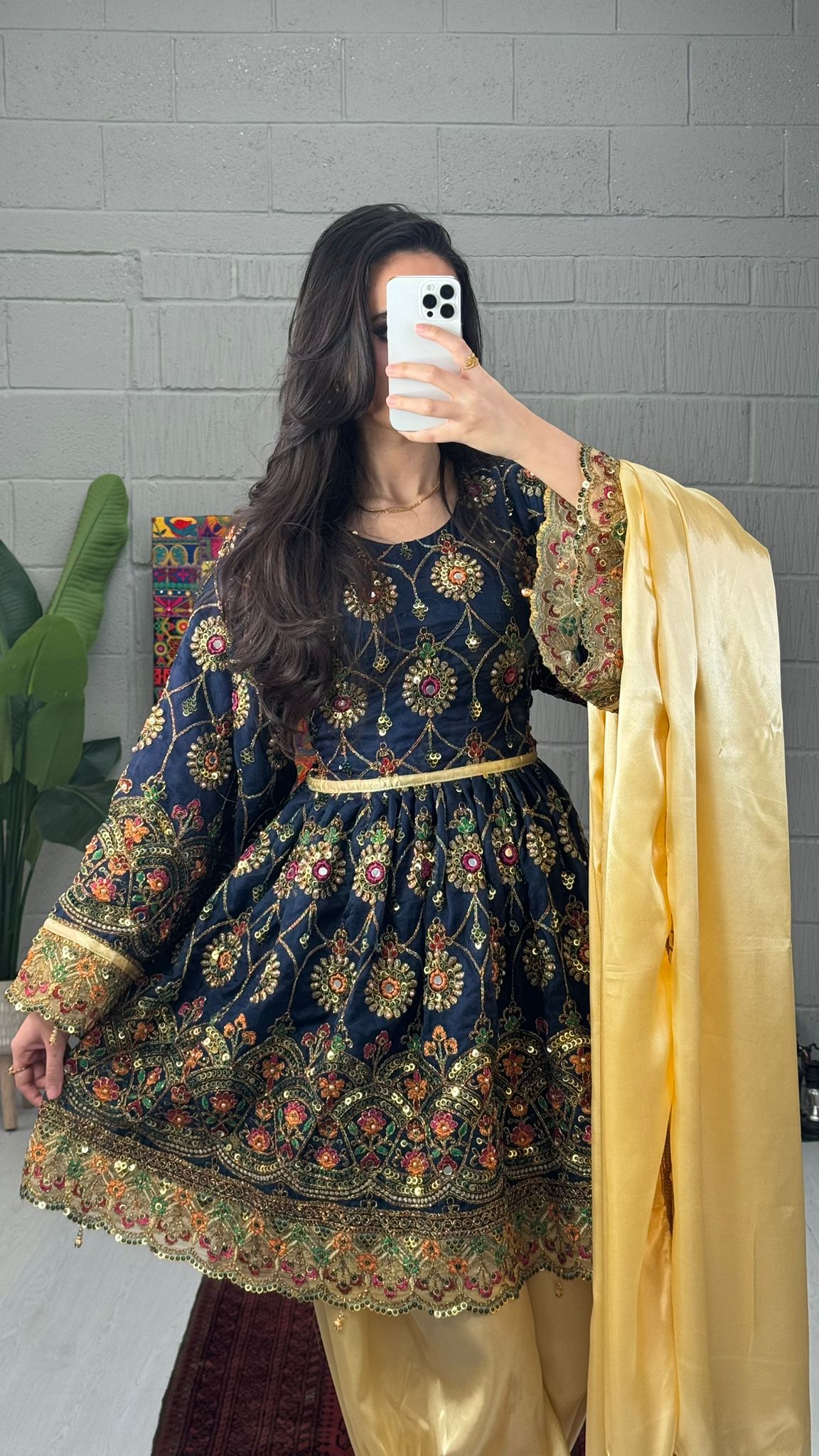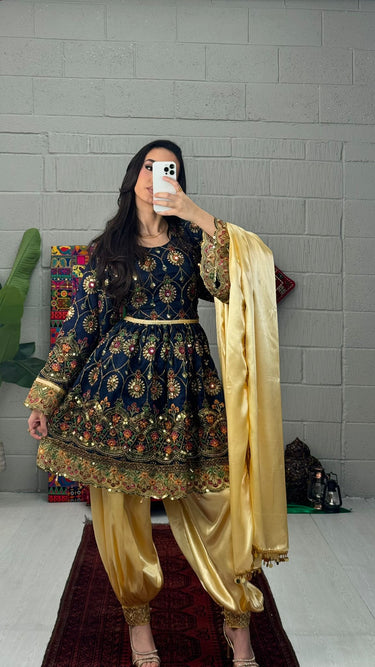 Gulzaar is a meticulously crafted three-piece suit featuring a unique design that enhances both aesthetic appeal and functionality. The back zipper closure ensures a streamlined fit, while the side belt allows for precise adjustments, accommodating various body types for optimal comfort and elegance.