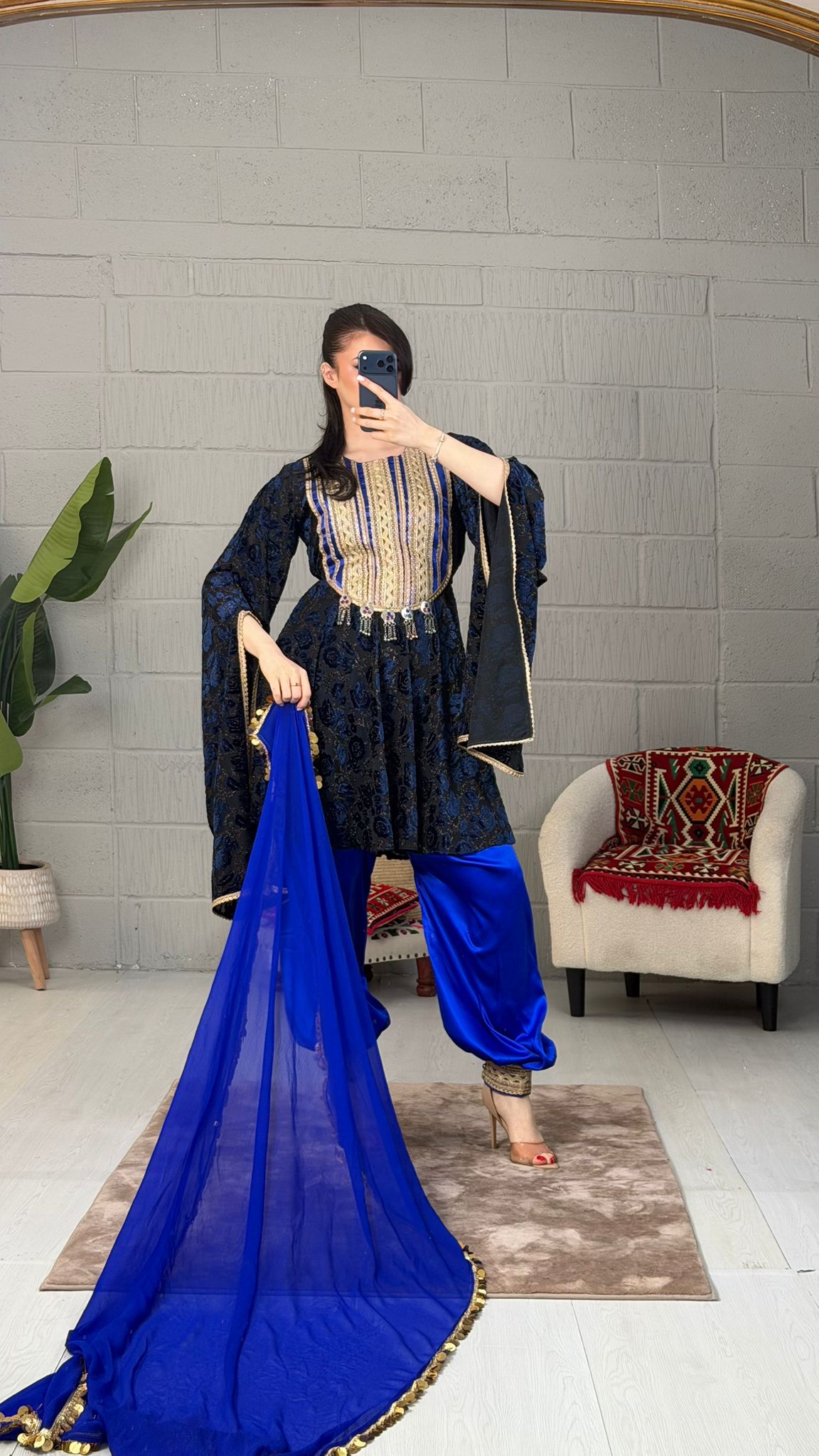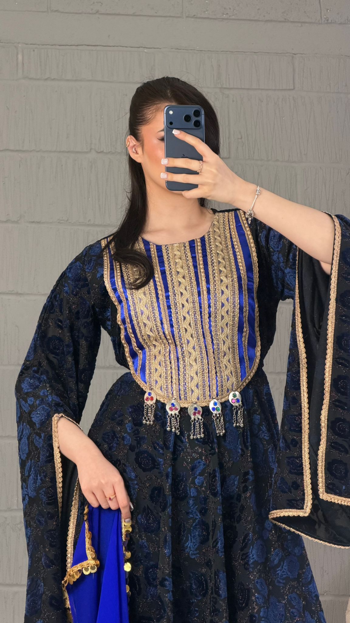 Helai is constructed from premium stretchy floral gaach bakhmal fabric, providing comfort and mobility. The neckline showcases intricate handmade Afghan and Indian lace, enhancing its aesthetic appeal. The silk trousers ensure a luxurious feel, while the plain chiffon scarf with golden borders adds elegance. This design combines traditional craftsmanship with modern style.