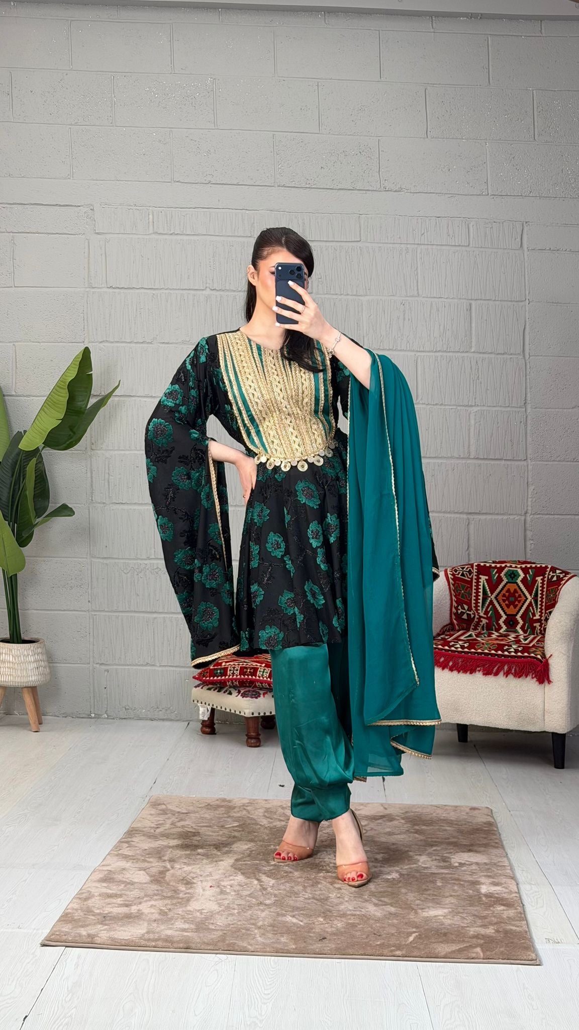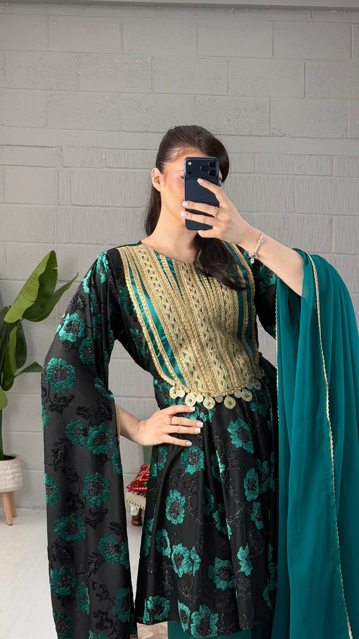 This product features premium stretchy floral gaach bakhmal fabric utilized in dress construction. The neckline incorporates intricate handmade Afghan and Indian lace, while the trousers are crafted from silk, complemented by a plain chiffon scarf adorned with golden borders.