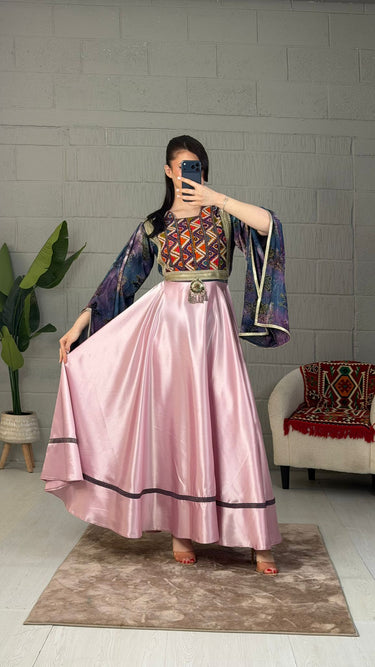 The Neptune satin dress features a distinctive sleeve design complemented by handmade embroidery on the chest, enhancing its aesthetic appeal. The back zipper ensures a secure fit, while the side belt allows for personalized adjustments. This combination of elements promotes comfort and versatility, making it suitable for various occasions.