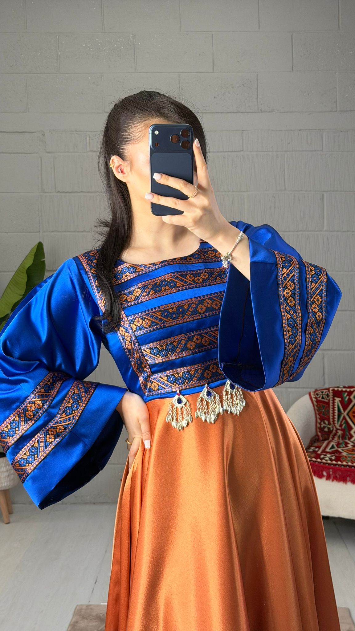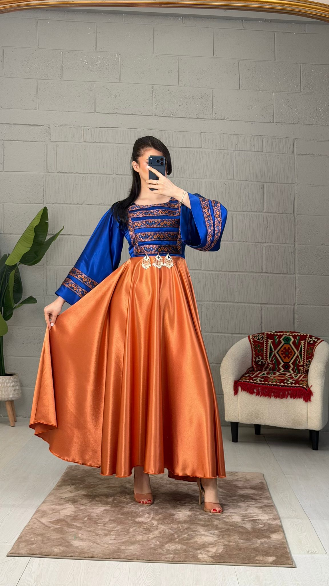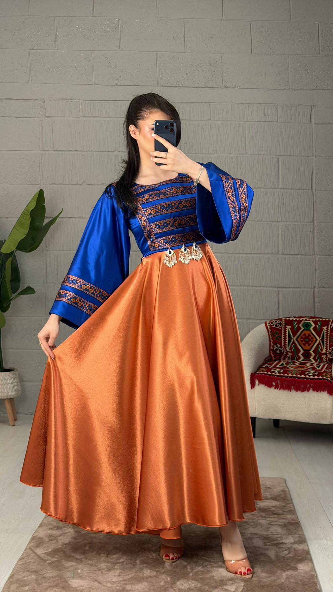 The Zohra satin dress features elegant trim border work on the chest and sleeves, enhancing its visual appeal. The back zipper closure ensures a secure fit, while the side belt allows for personalized adjustments. This combination of design elements results in a versatile garment suitable for various occasions.